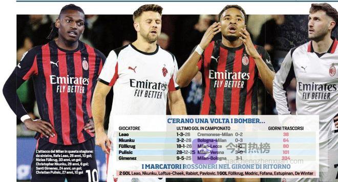 看看本赛季AC米兰前锋们的表现,希门尼斯意甲进球荒持续334天。自从2025年5月9日之后,这位墨西哥前锋就再也没能在意甲破门。伤病是他的借口,但漫长的等待已经让耐心透支。本赛季至今,希门尼斯在联赛中的进球数定格在0球。普利西奇进球荒超过100天,美国队长的最后进球要追溯到2025年12月28日,他在3比0战胜维罗纳的比赛中破门。此后,受到髂腰肌滑囊炎的影响,这位曾经的队内最佳射手陷入了长达数月的沉寂。进入2026年后,他在意甲登场8次颗粒无收。菲尔克鲁格的进球荒超过80天,冬窗加盟的德国锋霸表现可以用“高开低走”来形容。他的米兰处子球(也是截至目前唯一1球)是在2026年1月19日对阵莱切的比赛中打入,但这之后,进球便戛然而止。