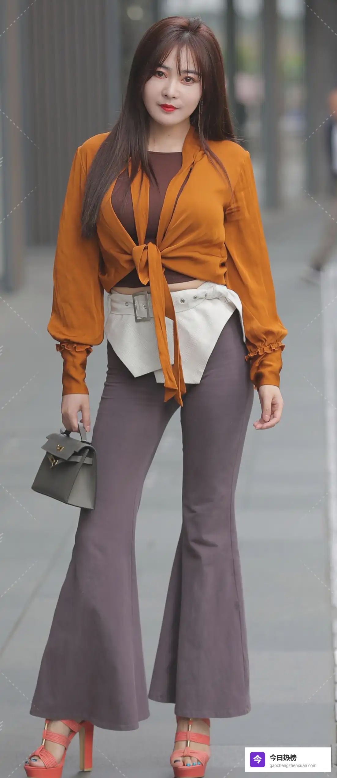 当焦糖色的阳光穿过梧桐叶隙,秋冬街头正上演一场关于「量感美学」的时尚革命。微胖女生不再是潮流的旁观者,而是用廓形剪裁与色彩哲学,重新定义着身体与服装的对话关系。本期街拍解析将聚焦这位身着焦糖色绑带衬衫与灰紫色喇叭裤的都市女性,解码她如何通过材质混搭与结构重组,打造出兼具温度与力量感的秋冬造型。