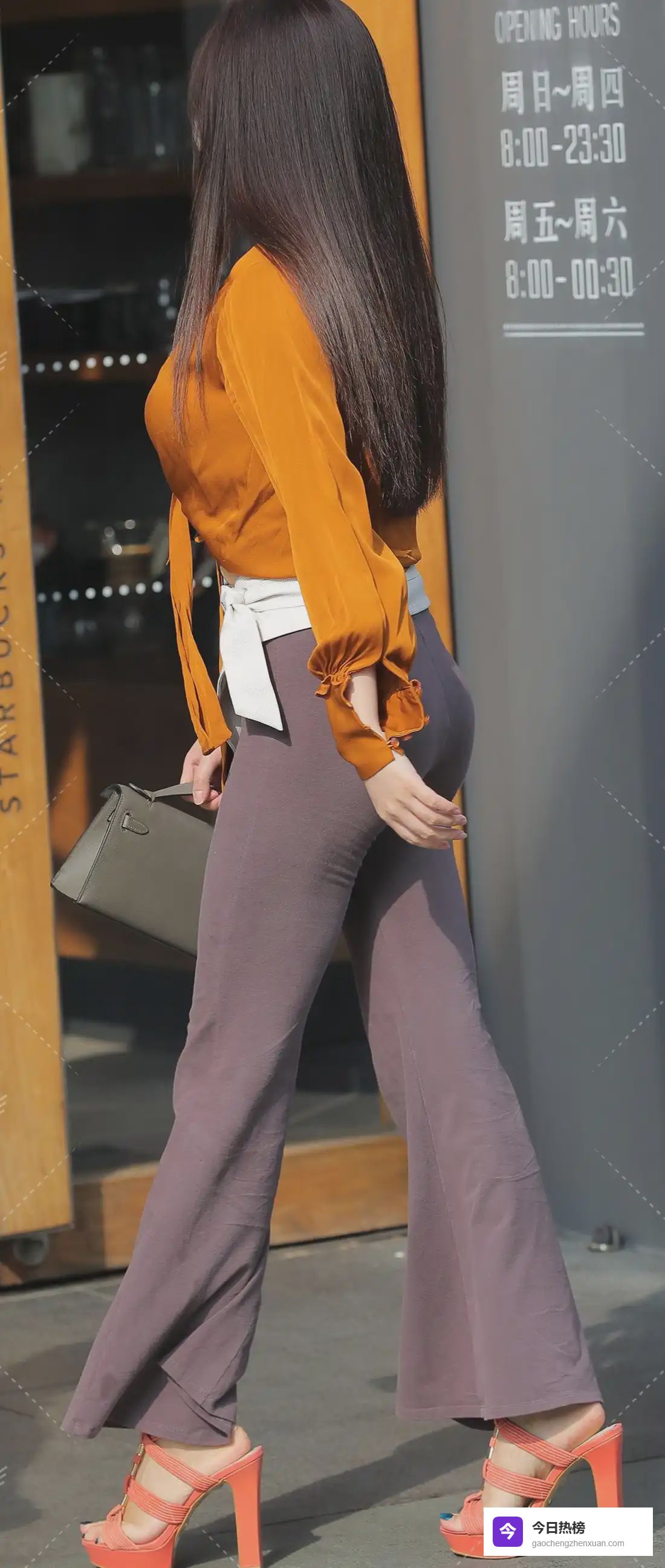 当主流时尚还在追捧紧身裤时,这位女士用灰紫色喇叭裤宣告了「量感裤装」的回归。从臀部延伸至脚踝的流畅线条,在膝盖处开始自然散开的裤脚,恰好掩盖了小腿肌肉线条,同时通过垂直向下的视觉引导,将观者视线延伸至地面。3cm的裤脚堆叠设计配合10cm防水台高跟鞋,在物理增高的同时,更营造出「裤脚扫地」的随性飒感。