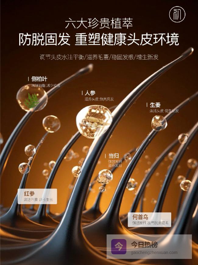 这款洗发水以侧柏叶、何首乌、当归、人参、红参、生姜六大核心植萃为核心!采用低温萃取技术,可保留 92% 以上的植萃活性成分、再搭配上专研的防脱因子,形成了多靶点的防脱固发体系。其中,侧柏叶、何首乌能够抑制5α- 还原酶活性,减少双氢睾酮对毛囊的损伤,阻断雄激素性脱发的核心诱因。人参、红参能够给毛囊提供大量的营养物质,滋养受损的毛囊,让我们的发根变的更加稳固,减少不正常脱发。生姜、当归能够促进头皮血液循环,加快头发的生长。加上转研防脱因子:亚美尼斯、可比落,直击脱发根源,全面激活毛囊活性,从根源解决脱发问题!