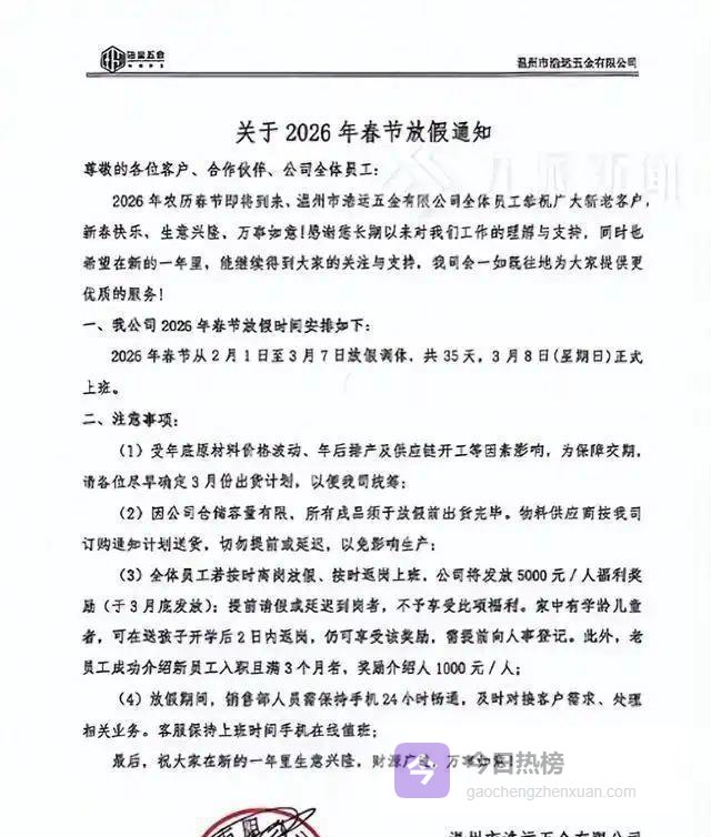 更讽刺的是,就在同一天,温州一家五金老厂因为春节放35天假、返岗奖5000元冲上热搜第9。人家明确说了,家有学龄娃的还能延后两天返岗照样拿钱。1月28日人事部透露,已有三家同行跑去“取经”。一个是把人当人,一个是把人当账上的可删项,差距比车间机床和玩具车还大。