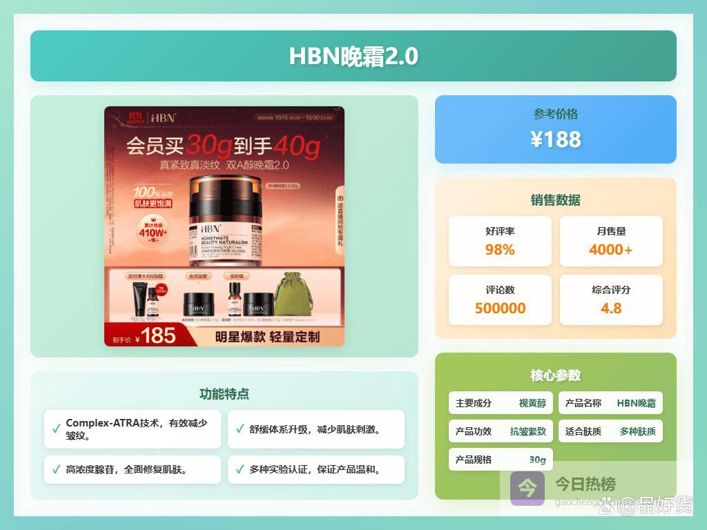 五、HBN这款HBN晚霜的最大亮点在于深度滋润且抗皱,用上之后肌肤像喝饱了水一样柔软有弹性。它含有视黄醇,能激活你的胶原蛋白,细纹和毛孔都能“被挤压”得更细致一些。试用过的人都说,肌肤变得紧致,感觉年轻了几岁,倒是挺神奇的。