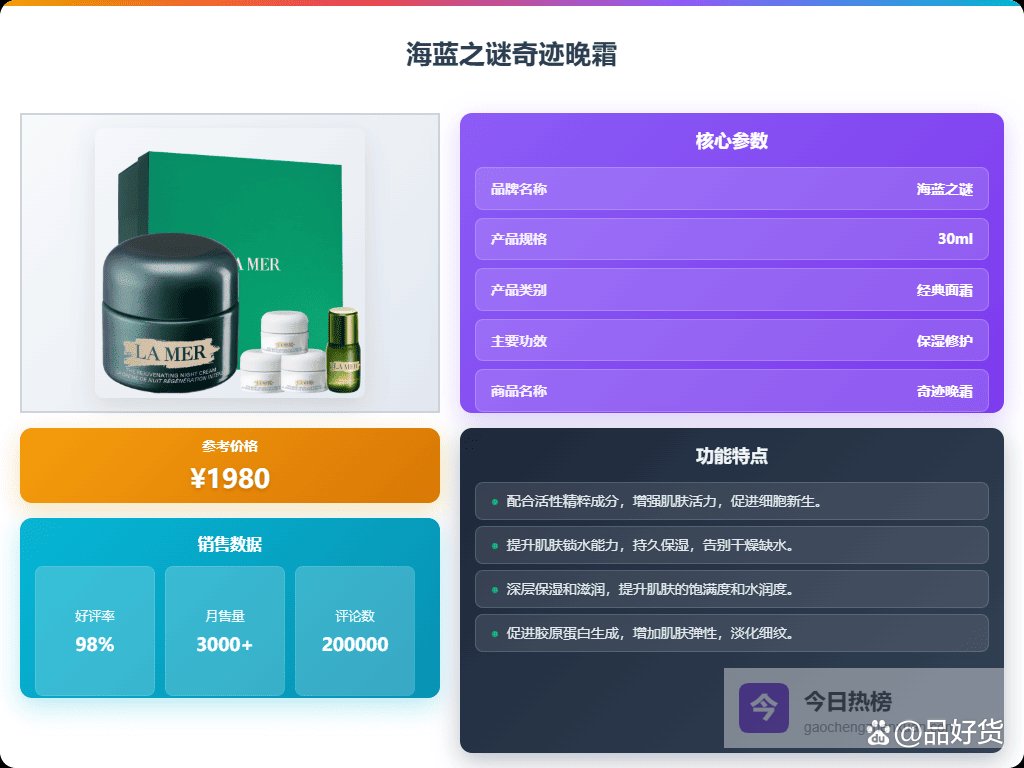 二、海蓝之谜这款海蓝之谜奇迹晚霜的深层修护能力绝对算得上“养出新生肌”的神器。它帮你激发肌肤的自我修复力,像给皮肤开了个夜间修炼班,醒来皮肤状态都能“焕然一新”。试用感不错的朋友说,第二天皮肤明显更细腻光滑,就像夜晚偷偷帮肌肤充了电。