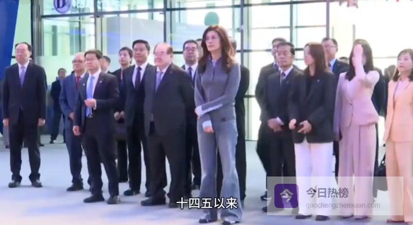 第五天参访中关村,风格顿变,一身浅灰针织衫+浅蓝直筒牛仔裤的休闲搭配。这种“去正式化”的穿搭,配合她收到高科技礼物时惊喜的表情,瞬间拉近了与年轻网民的距离。