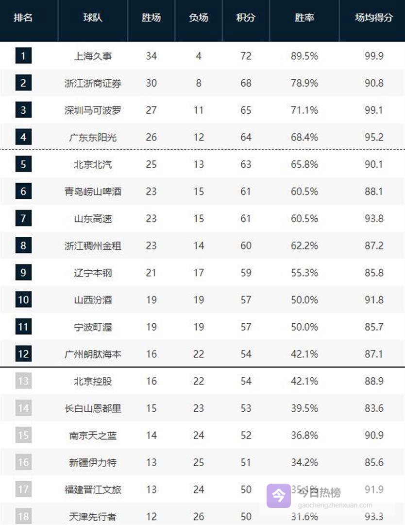 广东队被挤到第四,26胜12负。 北京队则直接掉出了前四名,25胜13负排在第五。
