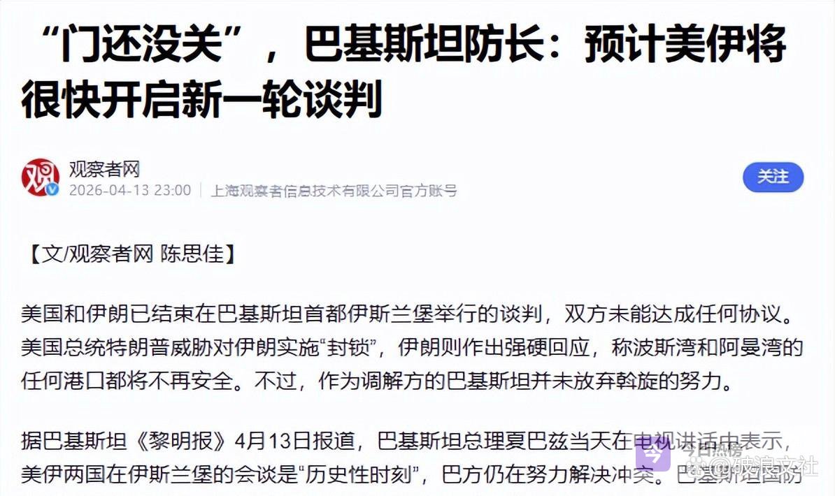 “新一轮对话即将展开。”这场激烈对峙的起因,源于巴基斯坦首都伊斯兰堡的一场谈判。美国和伊朗在伊斯兰堡进行了长达21小时的面对面谈判,这是双方多年来罕见的直接对话。