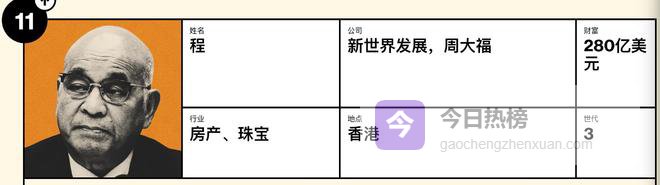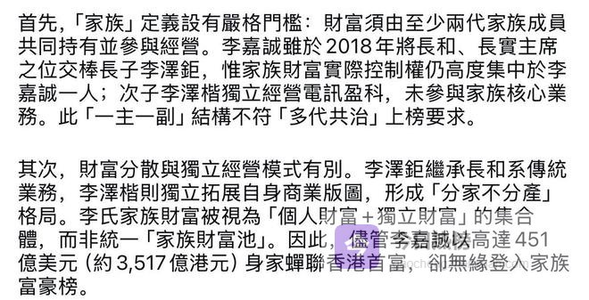 回头来说,在福布斯公布的2026香港富豪榜上,李嘉诚以451亿美元的身家排在第一位,然而到了家族富豪榜,竟然没有上榜,而以李嘉诚至少451亿美元的身家至少也应该在前五才对,这令不少人深感意外。实际上,这也不是统计的遗漏或是错误,而是统计的方式不同。这个富豪榜以家族为单位,在门槛上的设定,需要至少两代家族成员共同持有并且参与经营,才能将财富统计在列。