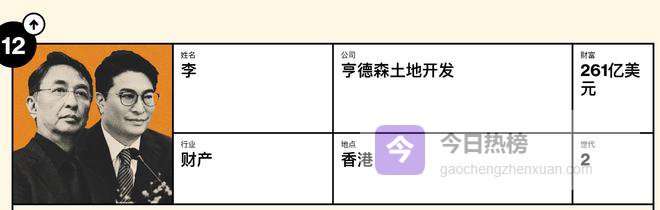 李嘉诚虽然已经在2018年将长和、长实的主席交给了长子李泽钜,但是实际上整个家族的财富仍然掌控在李嘉诚手上,事实上,在福布斯富豪榜上,根本就没有李泽钜的名字。而李嘉诚的小儿子李泽楷虽然上榜,但他是独立经营电讯盈科,不参与家族核心业务,而他的业务也不是与父亲、兄长共同经营。简单来说,李泽楷与李泽钜在发展上各自独立,有各自的商业版图,因而不能算是统一的家族财富。