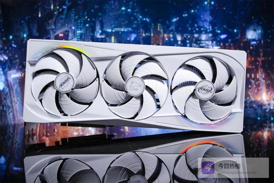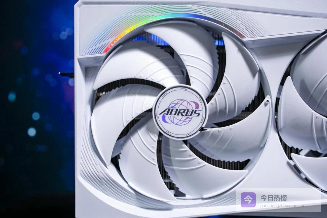 外观设计上,依旧是纯白的配色,和上面提到的两款技嘉产品很搭。正面有棱角分明的边框和风扇边的彩色条纹做装饰,整体给人的印象非常简洁硬朗。侧边的“AORUS”标志旁配备了一块小的显示屏,点亮后除了可以显示一些显卡的运行信息外,还可以显示自定义的文本、图片和GIF。