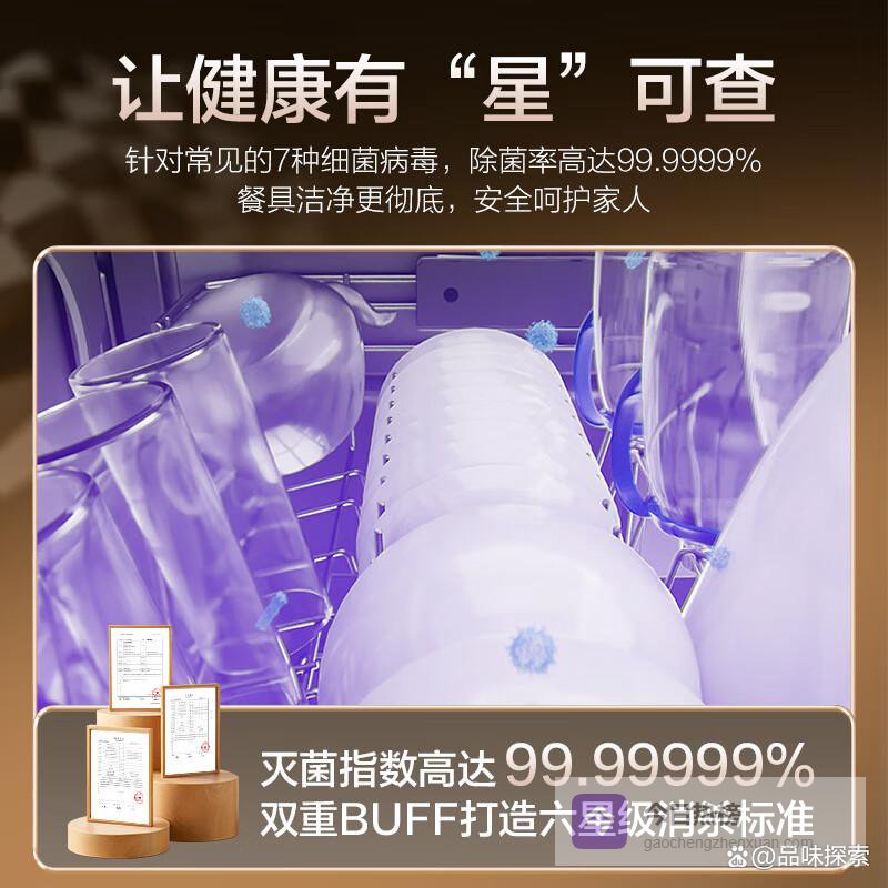 这款洗碗机搭载了AI四驱双面洗技术,实现了360°全维净洗,无论是顽固的污渍还是复杂的形状,均能轻松应对,让每一个餐具角落都得以彻底清洁。此外,结合高温和UV除菌双重消杀技术,确保餐具的除菌率可以达到99.9999%,为家人的健康保驾护航。