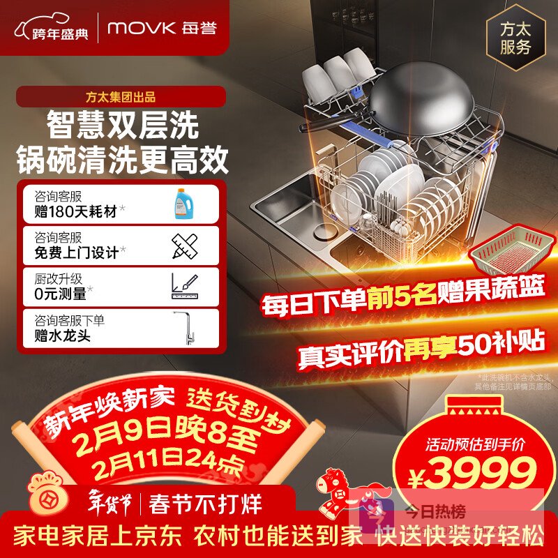 【京东自营】每誉【水槽式洗碗机YU10】双层锅碗同洗80L大容量100℃蒸汽除菌不锈钢水槽一级水效美¥