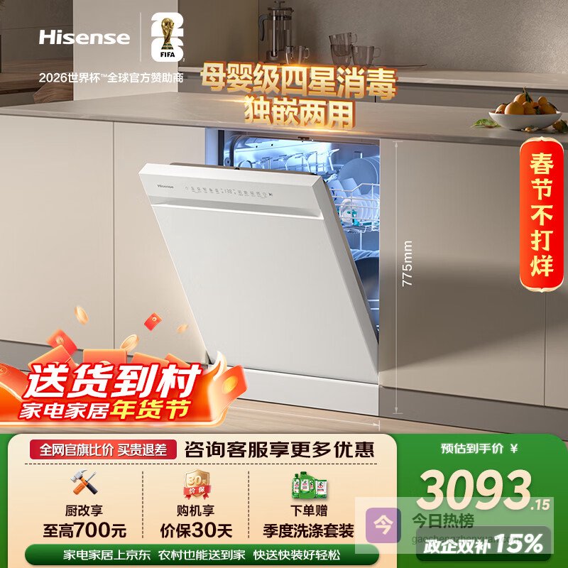 推荐入手:海信嵌入式15套净水洗碗机Y301iSW