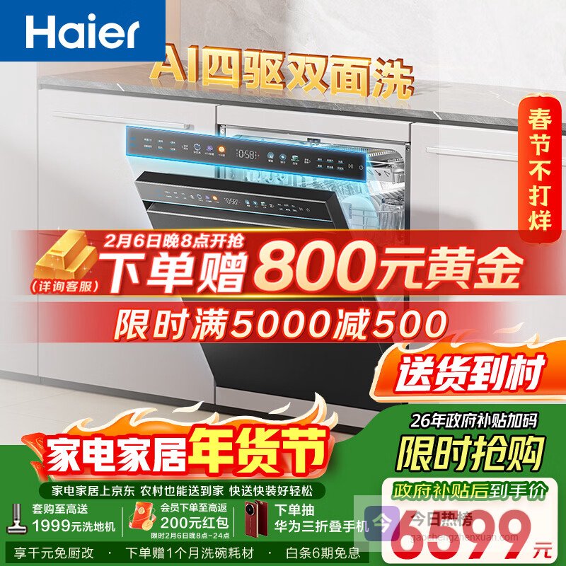 【京东自营】海尔【四驱双面洗W5000SPro】洗碗机嵌入式150升+大容量智能开关门速干UV除菌1¥