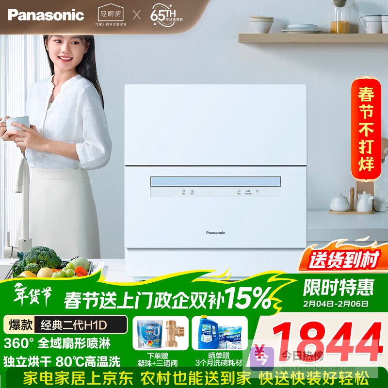 【京东自营】松下台式洗碗机二代H1D【小尺寸大容积58L】独立烘干80℃高温除菌洗烘一体软水系统家用¥