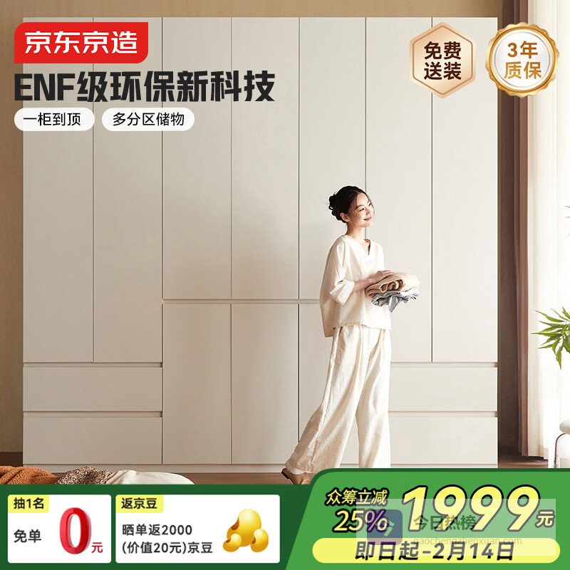 【京东自营】京东京造2026新云素衣柜ENF级现代简约卧室环保收纳储物白色开门衣柜五门¥