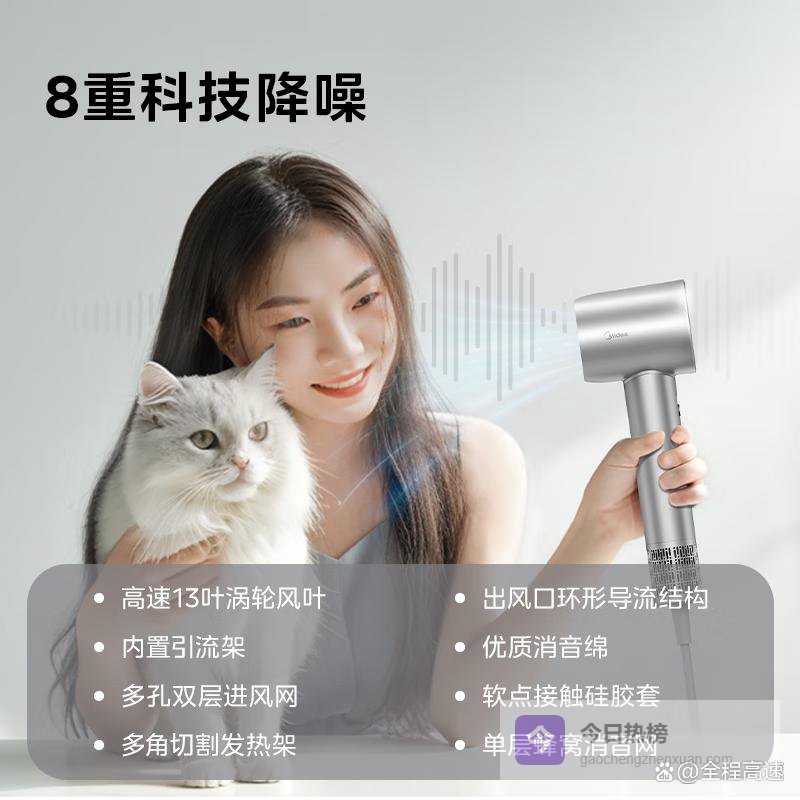 【商品推荐】一:美的高速吹风机FG208这款机器把“高效干发”这件事做得特别实在。它采用8重降噪结构设计,从源头抑制电机振动与气流湍流,配合13叶高速涡轮扇叶和内置引流架,风量输出既强劲又稳定。特别值得一提的是它的多孔双层进风网,能大幅减少头发吸入风险,日常使用更安心。风道经过流体仿真优化,出风集中不散乱,三分钟就能吹干中长发,发尾也不毛躁。