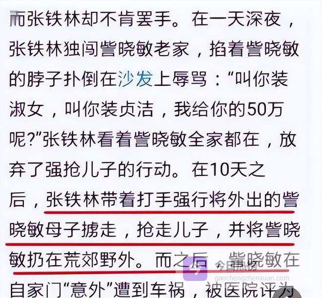 随着儿子一天天长大,訾晓敏也渐渐走出了过去的阴影,就在她准备和儿子继续安稳度日,好好生活,彻底淡忘这段不堪的过往时,2009年,消失已久的张铁林突然现身,二话不说就抢走了儿子,并强行将断了訾晓敏和儿子的联系。