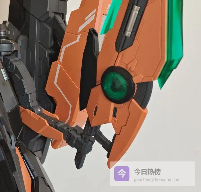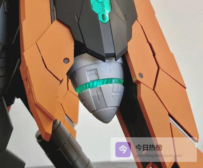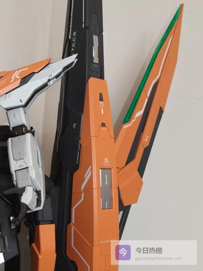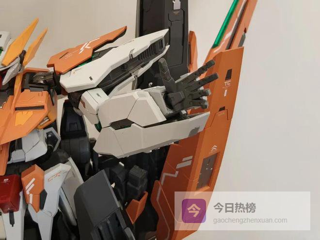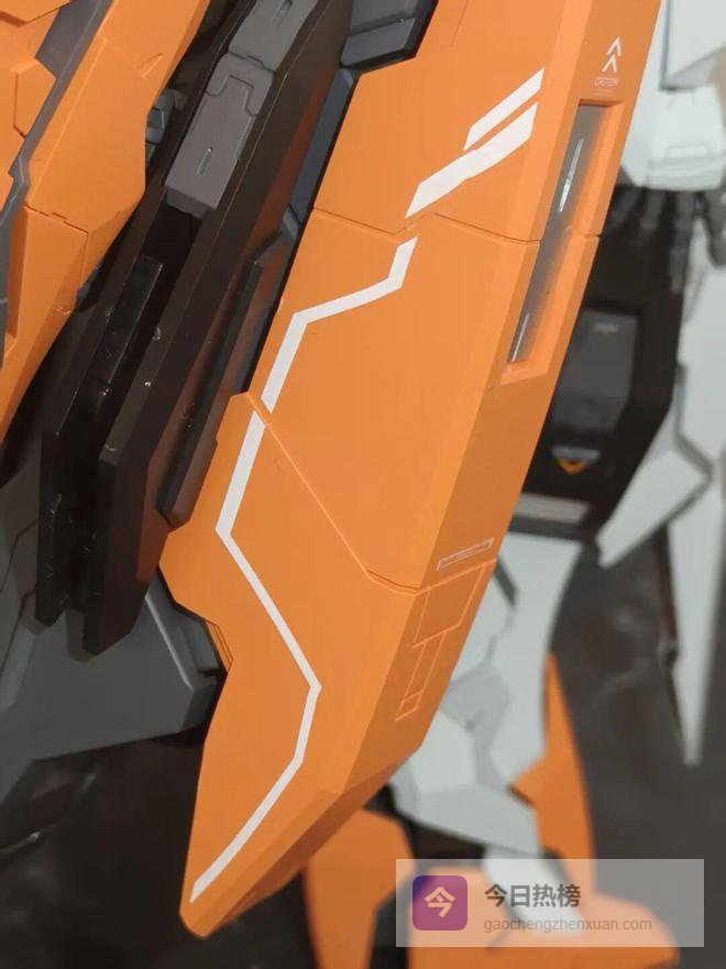 不过,即便过程痛苦,妖天使的颜值还是十分可圈可点的。先看主体部分。它的外形来源于一位GK造型师(类似变形金刚的DMK)的改件,得益于GK本身优秀的设计,这款妖天使在外甲细节上也非常亮眼。外甲采取两种不同深浅的橙色和两种不同深浅的白色进行分色,在本就丰富的细节刻线上凸显更多层次感。部分位置的细节还用了镂空的工艺以凸显下面的银色零件,进一步增加细节量,让整个主体在不加上背包的情况下显得依然不素。