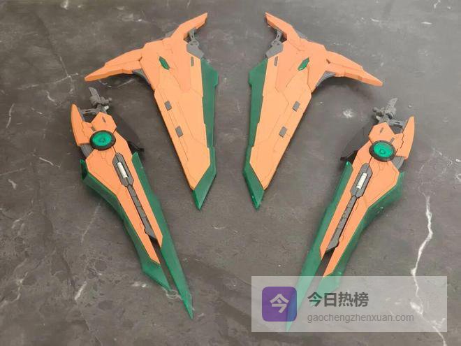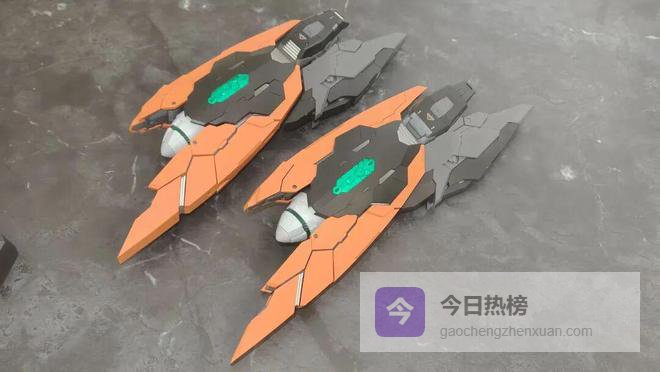 之前提到,妖天使在剧场版后期还有一个最终决战样式,也就是腿部替换成大型GN推进器的模式。装上外甲后,两个推进器的造型差不多就是这样。它们的尺寸度十分夸张,拿在手中跟个火鸡腿似得。