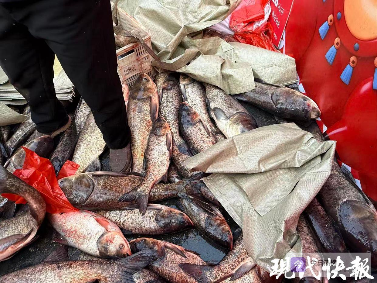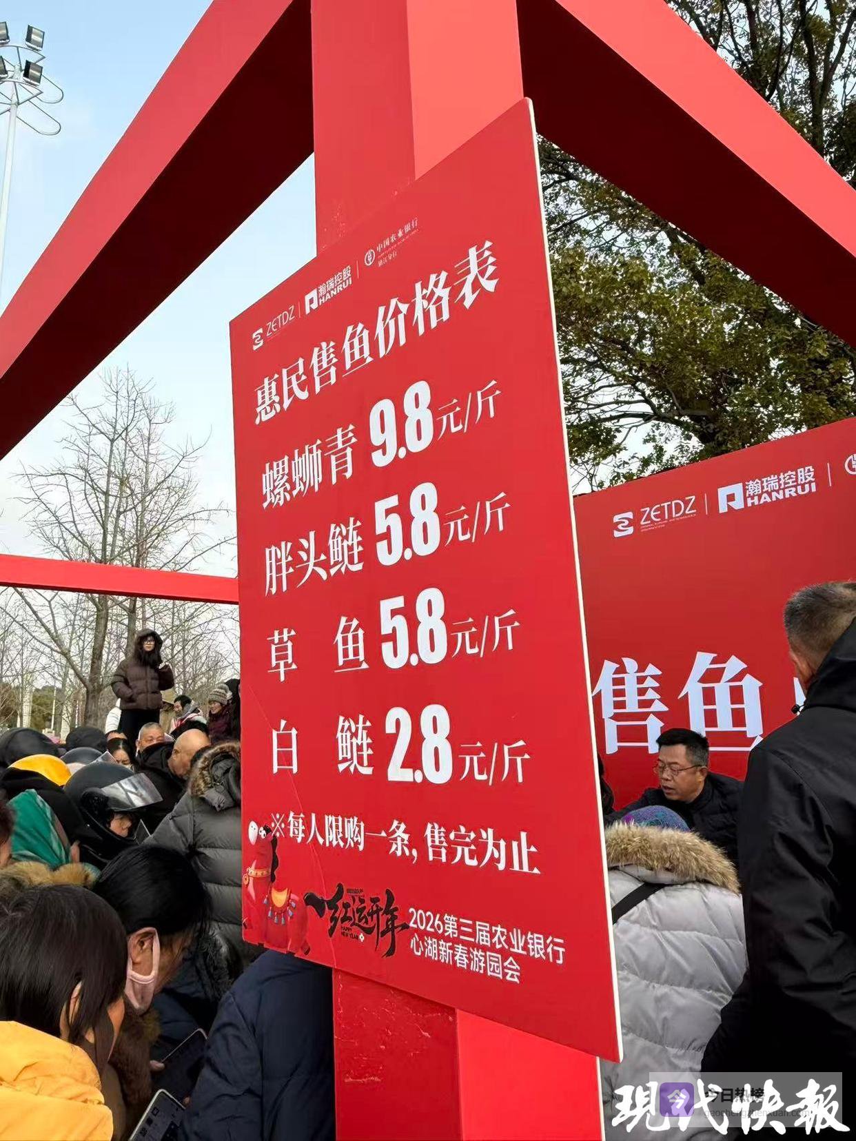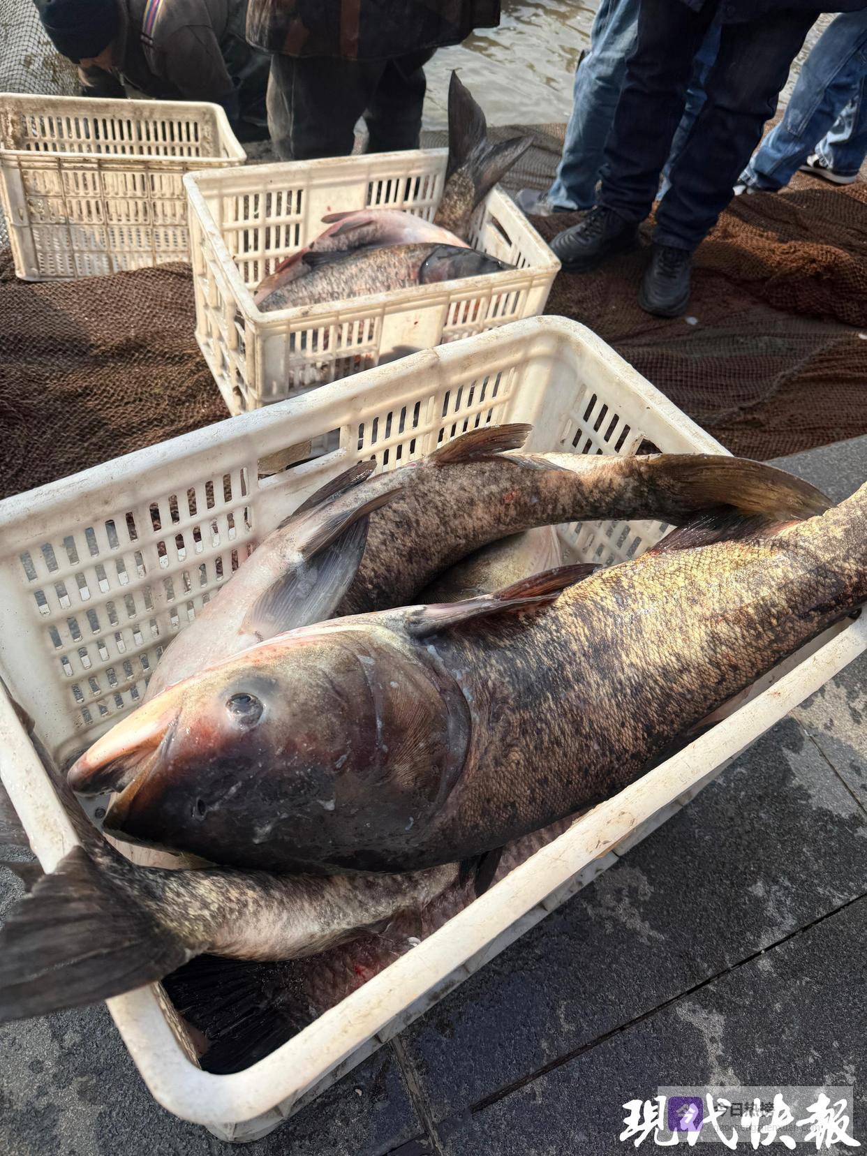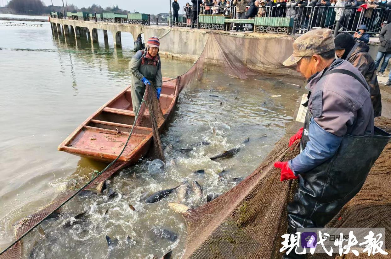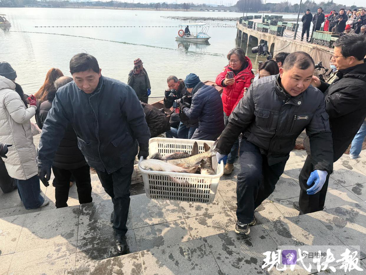 渔工们将重量达标的大鱼送往岸边的临时鱼箱,而个头较小的鱼则被小心地放回湖中。刚出水的鲜鱼被一筐接一筐运至湖畔临时设立的惠民售鱼点。许多附近居民早已闻讯赶来,在售鱼点前排起长队,满怀期待地等候这寓意吉祥的“年鱼”。“这些鱼个头大,肉质好,而且价格便宜,年年有余嘛,就想图个喜庆,沾沾喜气,期盼新的一年有好运。”家住心湖公园旁的李先生早早排队等候,“抢”下了一头花鲢。
