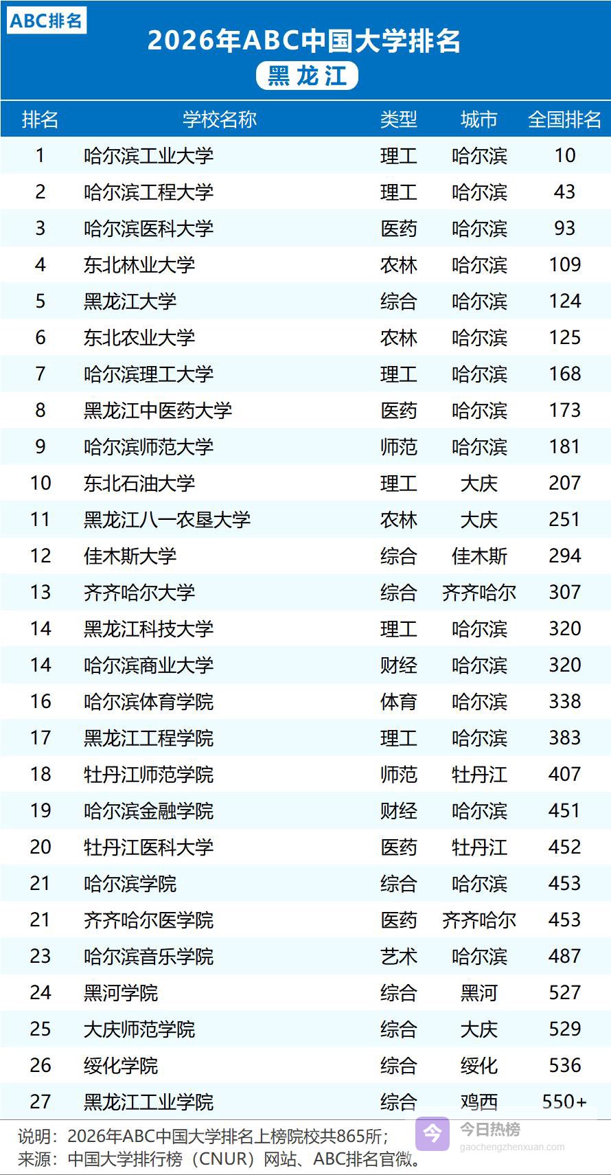 2026年ABC中国大学排名揭晓,黑龙江高校整体表现亮眼。哈尔滨工程大学位列全国第43位,船舶与海洋工程领域领先;哈尔滨医科大学排名93,医学研究实力突出;东北林业大学居109位,农林学科创新成果丰硕;黑龙江大学和东北农业大学分列124、125名,综合教育与农业科技贡献显著;哈尔滨理工大排名168,工程技术应用广泛。其他如黑龙江中医药大学(173)、哈尔滨师范大学(181)等均展现学科优势,推动区域教育发展。