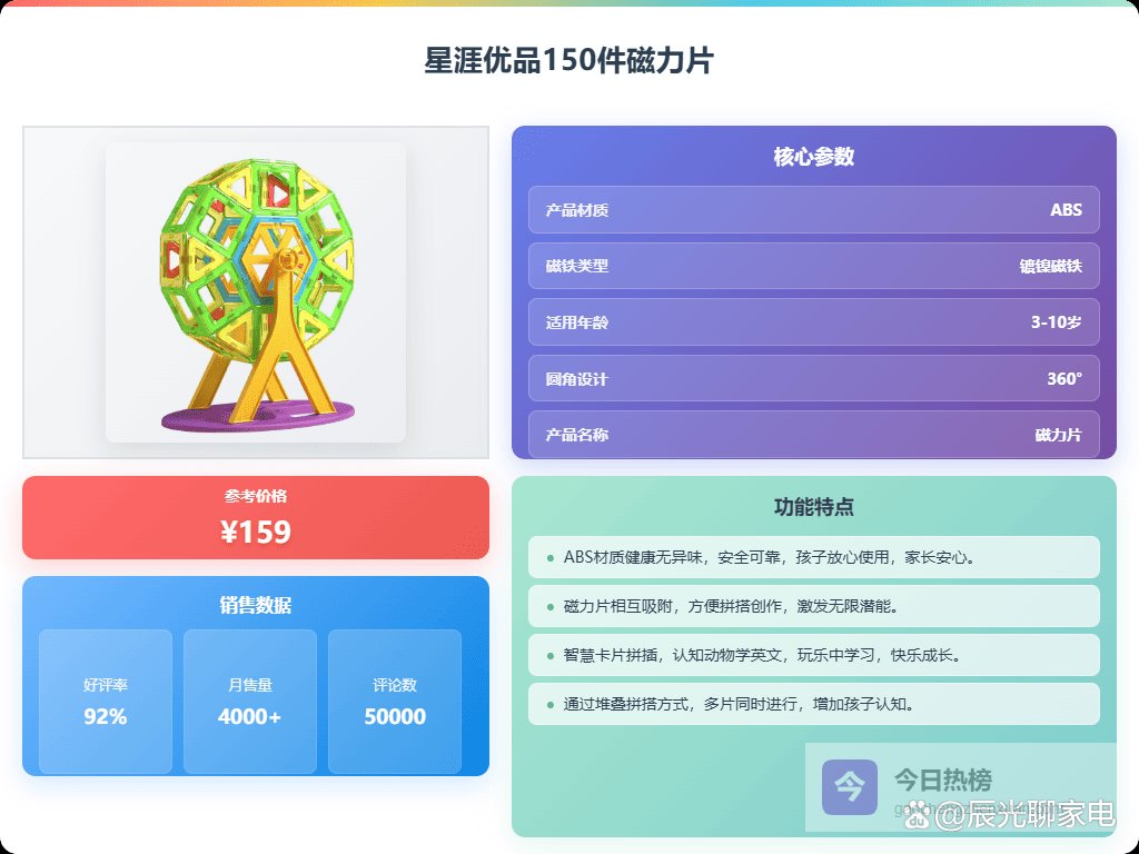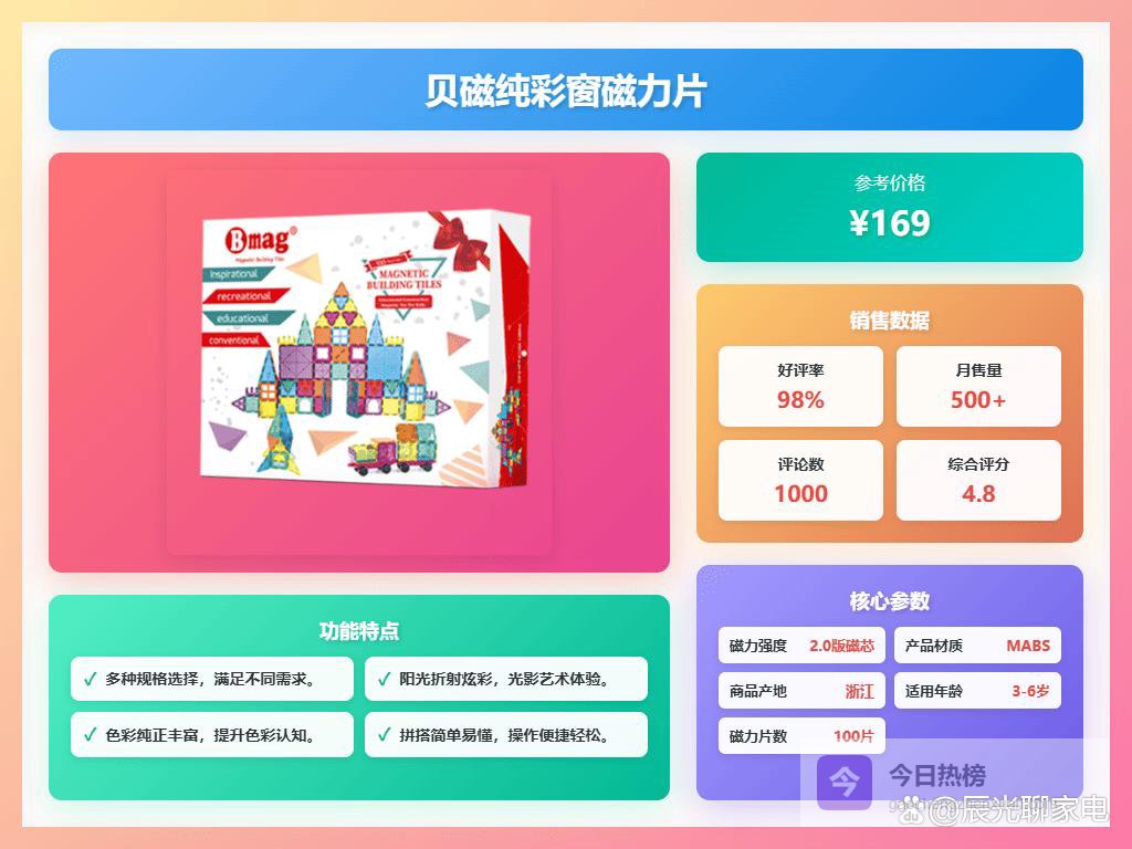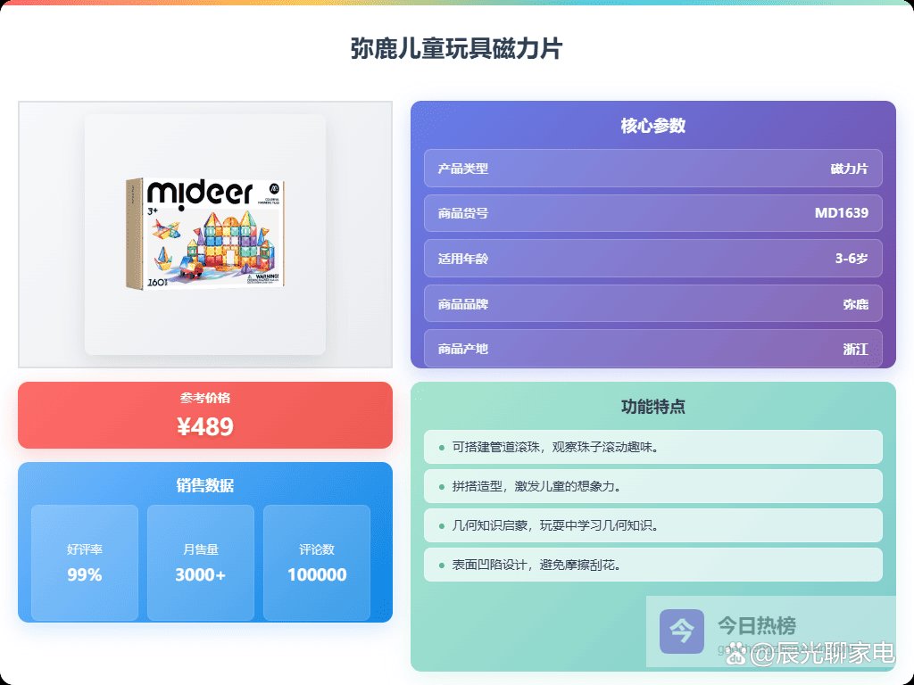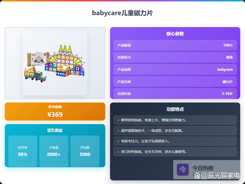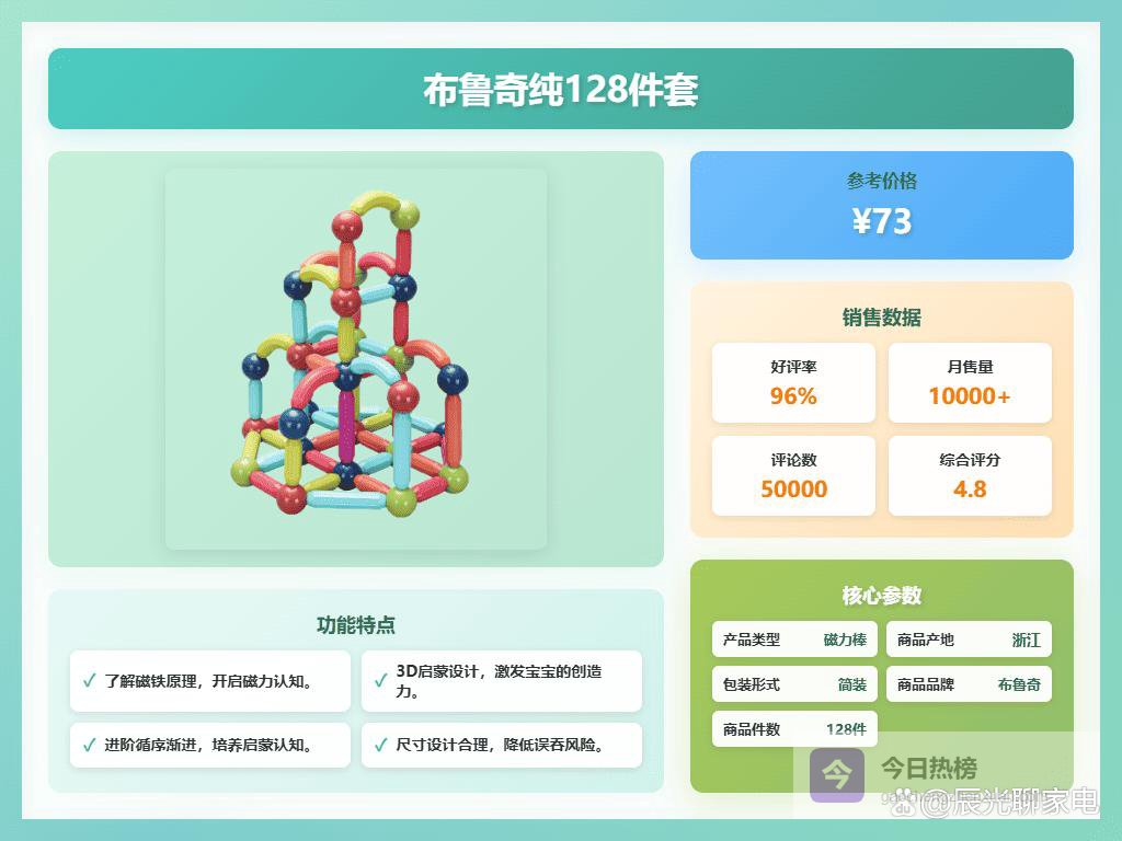 说实话,给孩子买玩具,我最看重的就是既要好玩,又能学到东西。最近磁力片特别火,身边不少朋友都在给娃玩,看他们拼的那些奇奇怪怪的造型,挺有意思的,感觉能激发孩子的创造力。但是市面上牌子这么多,到底哪个好用呢?磁力片十大品牌排行榜有没有参考价值?我研究了一段时间,发现磁力片确实挺值得入手的!