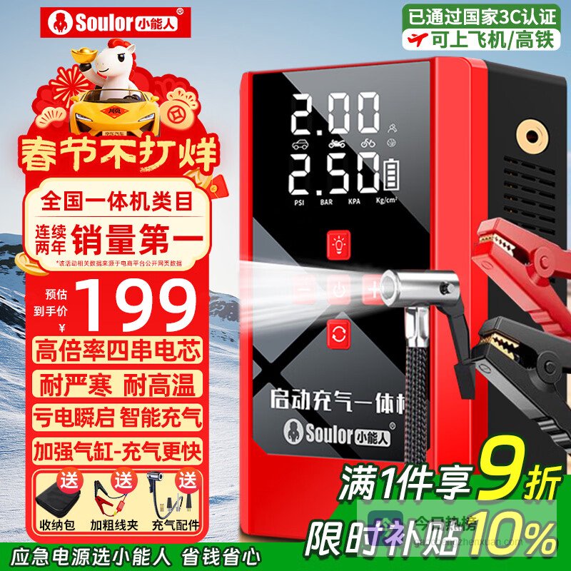 【京东自营】小能人【3C认证】汽车应急启动电源12V充气启动一体机备用电瓶打火器搭电宝启动宝轮胎打气¥
