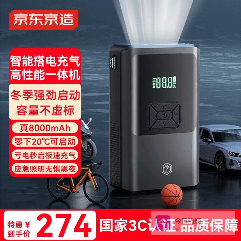 【京东自营】京东京造【3C认证】汽车应急启动电源充气泵一体机搭电宝电瓶充电器户外电源打气泵强启电源打¥