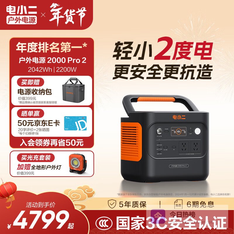【京东自营】电小二【轻小2度电】快充户外电源2200W大功率大容量220V移动电源车载露营应急户外作¥