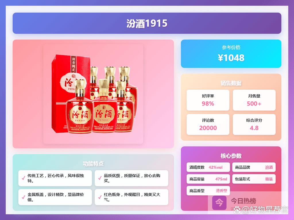 最近总有人问我“汾酒白酒买哪个好喝?”,说实话,这问题真不好一概而论。毕竟每个人的口味不一样,喜欢的香型和口感也各不相同。但要说汾酒,那还是有几款值得一试的,至少我自己喝下来感觉还不错。它的清香型特点很突出,入口挺顺,不会太辣,而且喝完之后嘴里留香,这点我个人挺喜欢的。至于“怎么样”、“好用吗”、“值得买吗”这些问题,我觉得是肯定的,关键看你喜欢什么味道。