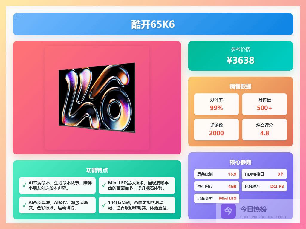 选酷开电视,首先得看你的预算和需求。如果追求极致的画质和观影体验,那100K6 Ultra绝对是首选,Mini LED背光技术加上4000nits的峰值亮度,简直就是一台家庭影院!当然,价格也相对较高。如果预算有限,又想体验高刷,那K3系列就很香了,144Hz高刷看电影打游戏都流畅到飞起。还有,别忘了关注尺寸,根据客厅大小选择合适的尺寸才能获得最佳观影效果。总之,选购酷开电视,明确需求最重要,这样才能选到最适合你的那一款。像我就挺注重护眼模式的,毕竟每天都要看电视,对眼睛好点才是真的。