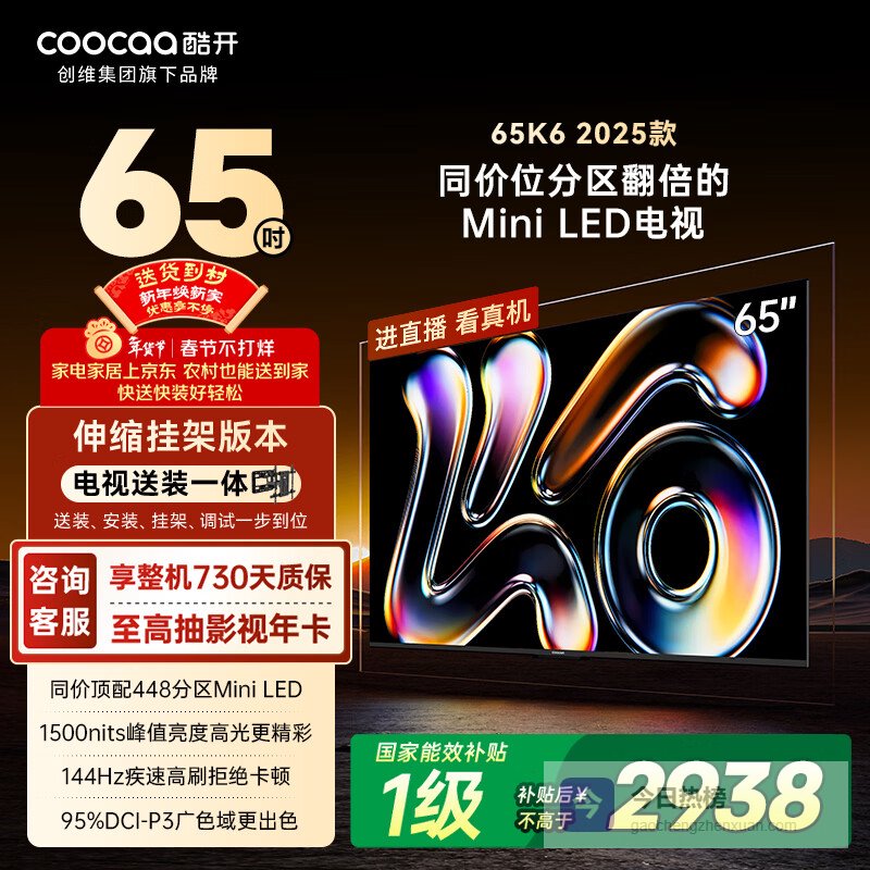 酷开创维65K6 2025款【伸缩挂架送装一体】448分区Mini LED 4+64G 以旧换新国家补贴平板电视机65P6F¥