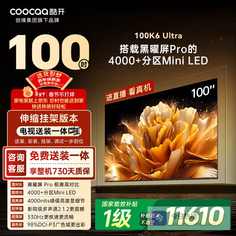 酷开100K6 Ultra【伸缩挂架送装一体】创维平板电视机100英寸 旗舰黑曜屏Pro Mini LED 显示器100P8F¥