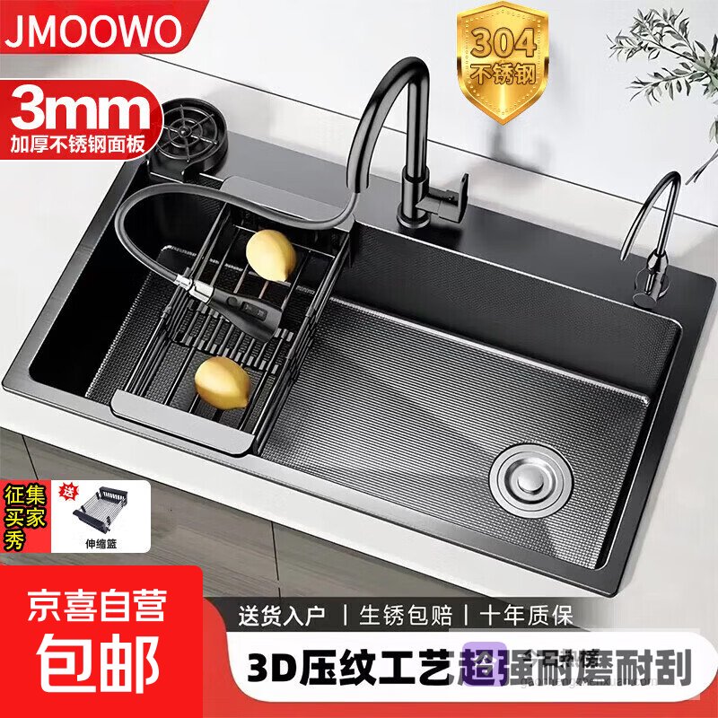JMOOWO洗菜盆水槽大单槽不锈钢加厚水槽家用防刮厨房洗碗槽洗菜池 75*45【侧边米粒加厚不锈钢】【抽拉+皂液+洗杯】¥