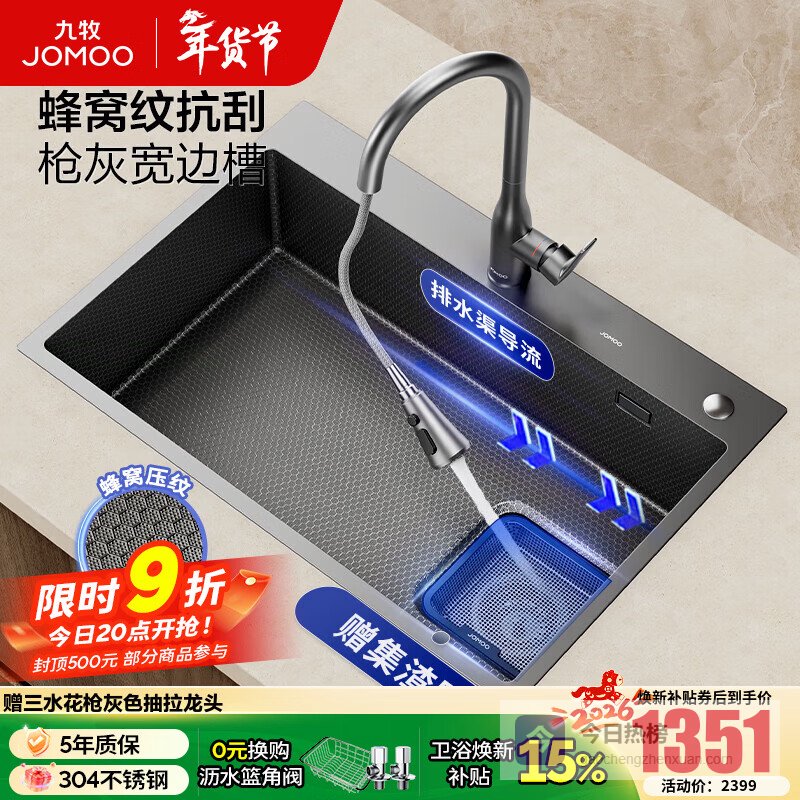 点评:这款水槽采用3mm加厚304不锈钢,用料扎实,耐腐蚀不容易生锈,用得够久不用担心变旧或损坏。表面经过PVD枪灰+蜂窝压纹+纳米疏水处理,抗刮耐磨,几乎不留划痕,日常使用更方便打理。蜂窝压纹设计让水槽更加坚固耐用,长时间用下来还保持光洁如新,不会轻易变形。