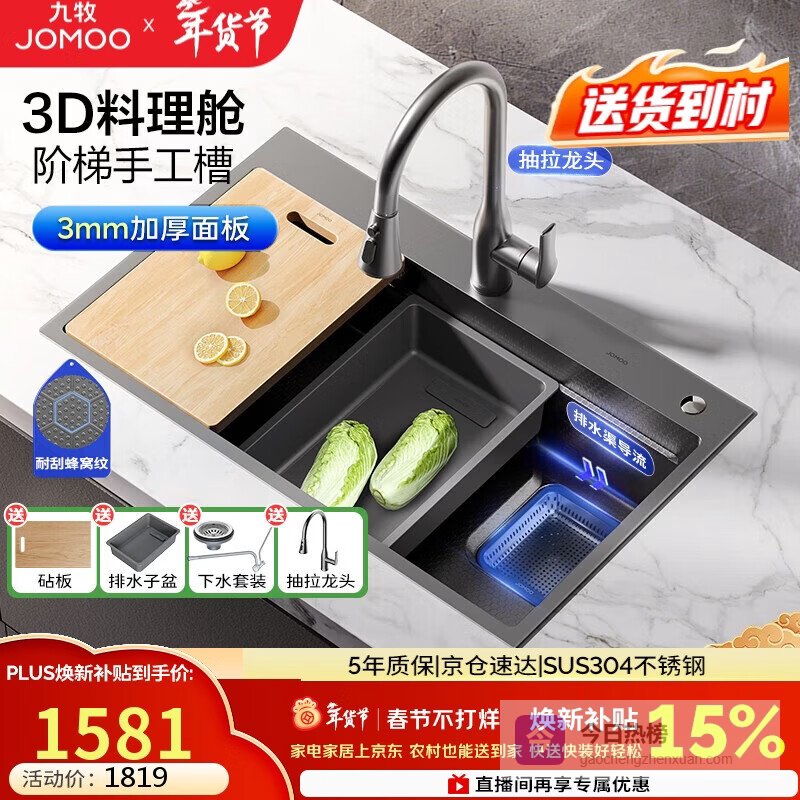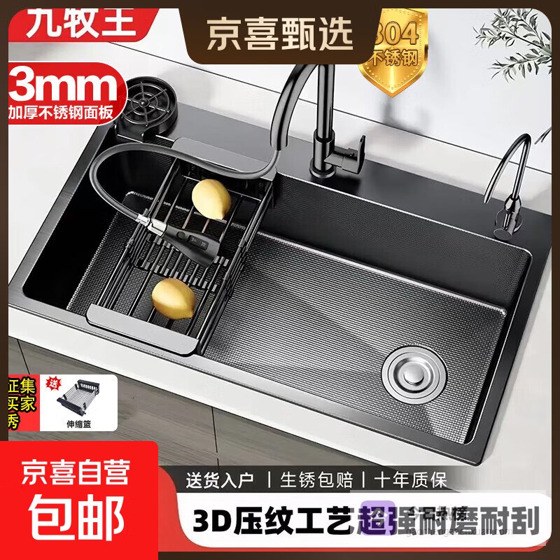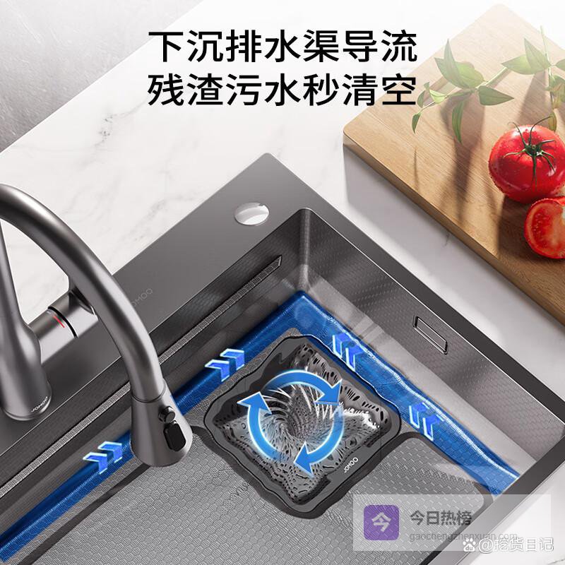 点评:这款九牧水槽确实挺用心的,3D魔法“料理舱”设计,让你切菜、洗菜、沥水都变得简单又高效,厨房操作空间变得更流畅。采用食品级304不锈钢,安全卫生,表面经过PVD黑钛处理,抗刮耐磨,保持光亮如新,挺耐用的。水槽容量达到42升,放大锅都没问题,非常适合家庭需要大量洗涤的日常生活。