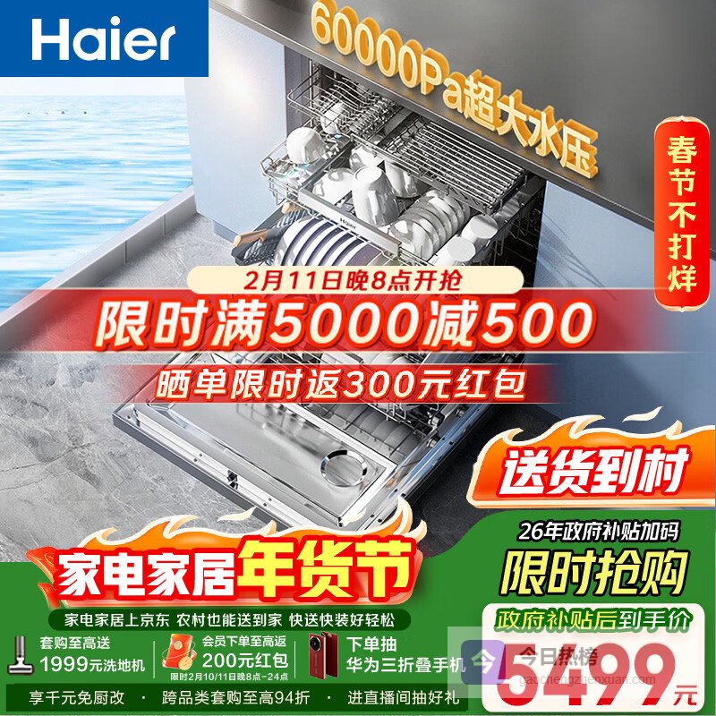 【京东自营】海尔【麦浪套系W5000Plus+】洗碗机嵌入式150升+升级双面洗大容量60000Pa¥