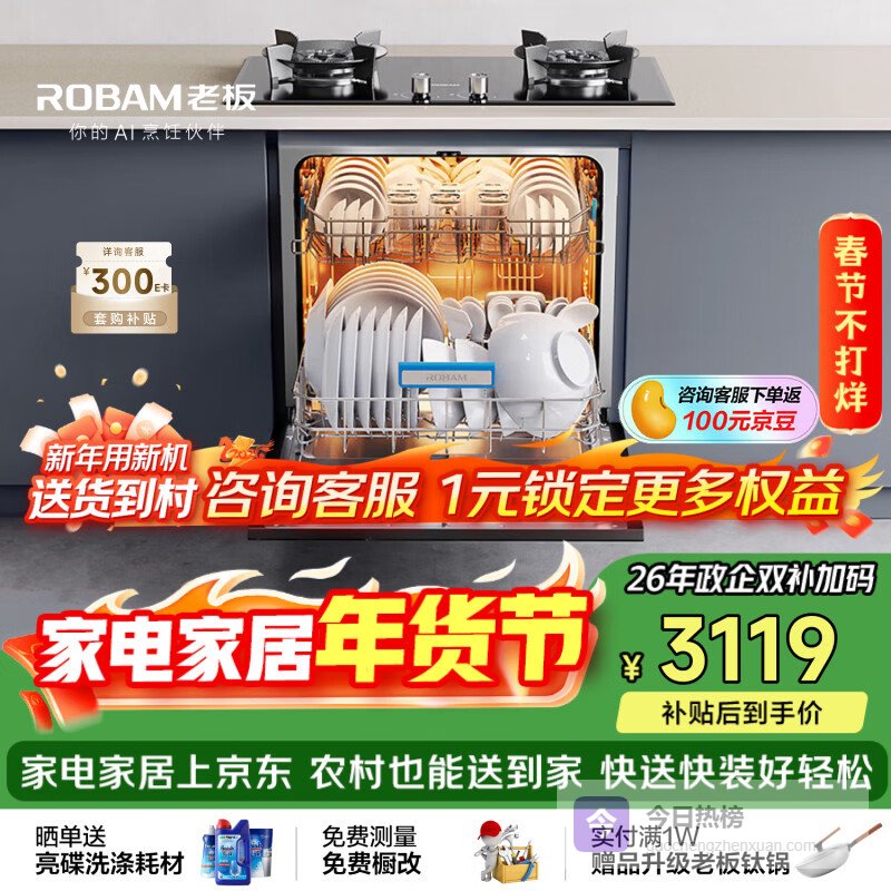 【京东自营】老板【灶下独立紫外消毒】B60D106升大容量洗碗机嵌入式家用全自动热风烘干一级水效0菌¥