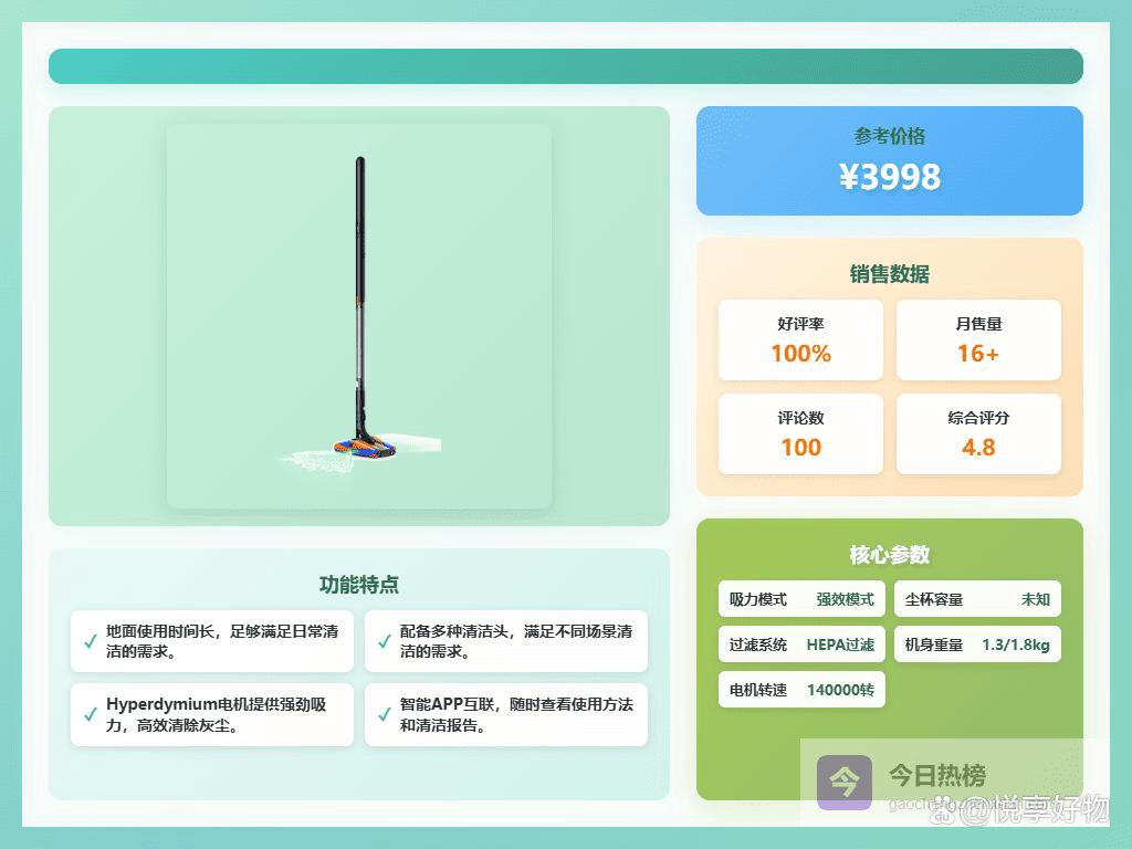 点评:这台吸尘器超轻便,整机只有1.3公斤,拿起来真是轻松不少,扫地变得更省力,特别适合追求轻巧的人。操作灵活,设计得很灵巧,能轻松转弯到每个角落,没有死角,打扫起来省心又干净。吸力强劲,用的是Hyperdymium™电机,转速高达每分钟140,000转,能轻松吸走各种灰尘和颗粒,家里宠物毛发也不在话下,效果挺稳。