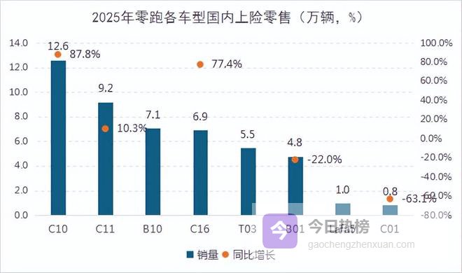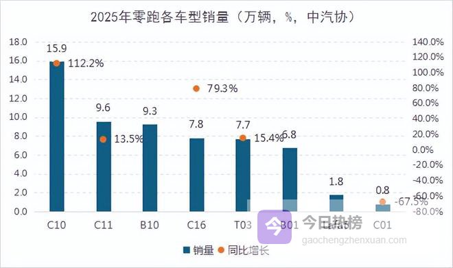 我们再来梳理一下2025年零跑旗下各车型的销量(包括出口)。2025年,零跑旗下在售车型一共8款,其中零跑C10、C11、C16、T03和C01均为2025年之前上市车型,2025年这几款车型的累计销量为41.8万辆,已经达到销量常态;零跑Lafa5、B01和B10为2025年上市车型,2025年这几款车型的累计销量为17.8万辆,还有一定增量空间。
