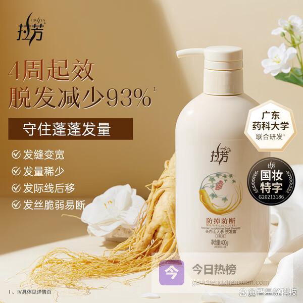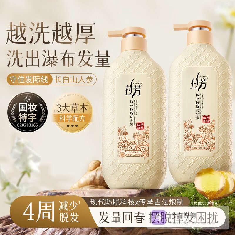 防脱发效果:这款洗发水专为防止掉发设计,添加了长白山人参成分,能帮助强化发根,四周使用后脱发量能减少高达93%,确实可以帮你缓解掉发问题,头发看起来更浓密一些。
