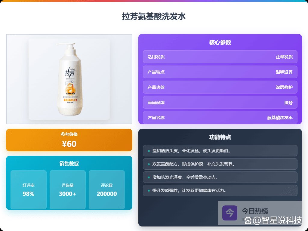 温和滋养:用的是双氨基酸配方,非常温和,能帮你温柔清洁头皮和发丝,同时形成保护膜,补充营养,特别适合敏感头皮或干燥发质,用起来还挺舒服。