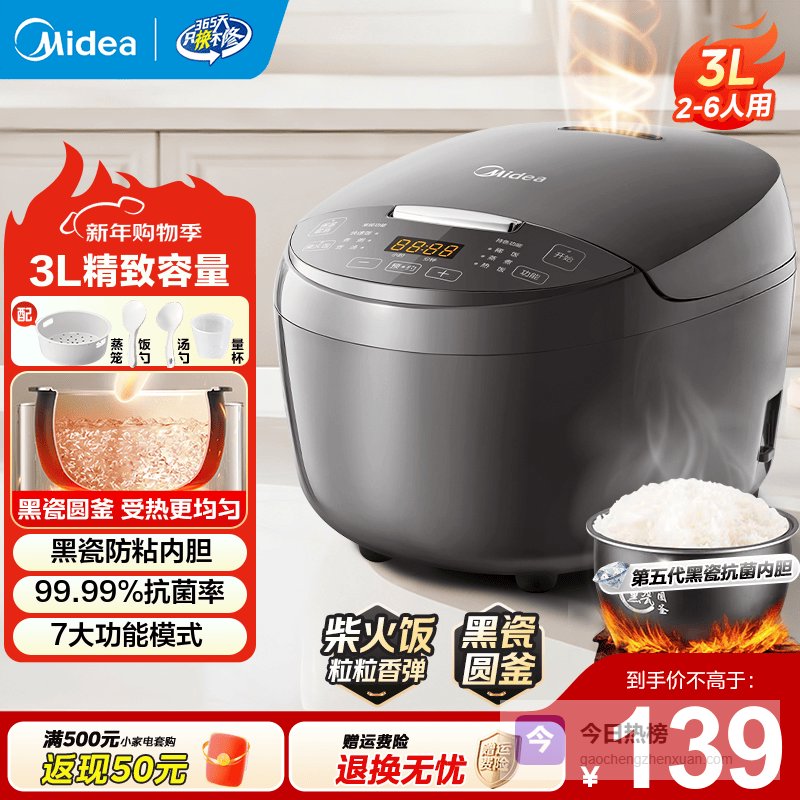 第3款:美的3L电饭煲这个电饭煲内胆用的是聚能黑瓷釜,确实能让米饭受热更均匀。而且它这个内胆有五层结构,最里面那层是黑瓷抗菌层,号称抗菌率能达到99.99%,用起来感觉更安心些。外面的铝合金层导热挺快的,能让米饭熟得更快,不粘涂层也让清洗变得更容易,基本不会粘锅,用水一冲就干净了。