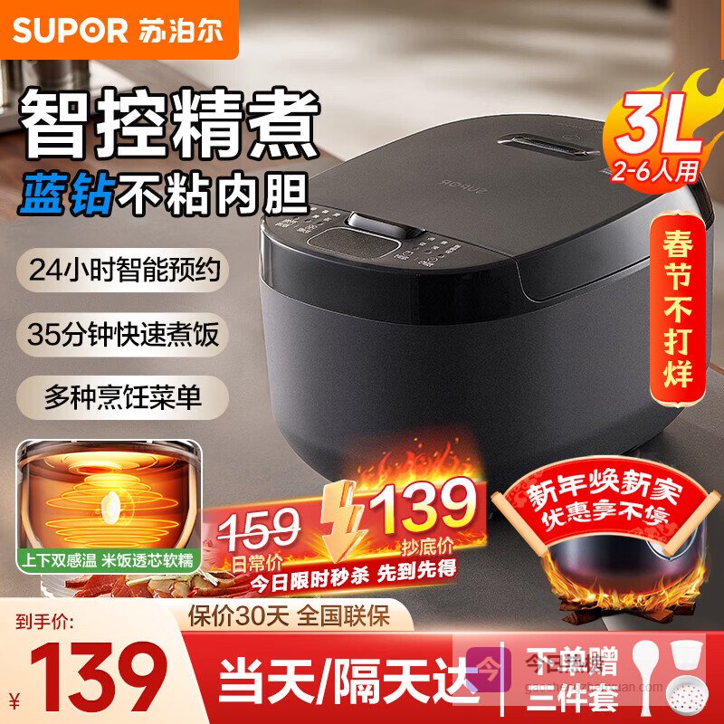 苏泊尔(SUPOR)电饭煲多功能蓝钻厚釜内胆电饭锅3升大容量煮饭煮粥饭煲2-3人使用家用微压煮饭锅 家用不粘系列 3L 蓝钻不粘内胆¥