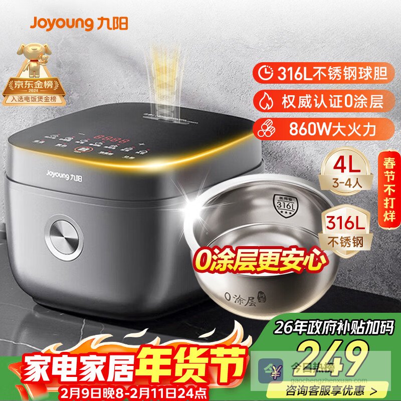 九阳(Joyoung)【0涂层】4升家用3~4人微压电饭煲电饭锅大火力5A好米饭无涂层316L不锈钢内胆40F316L¥