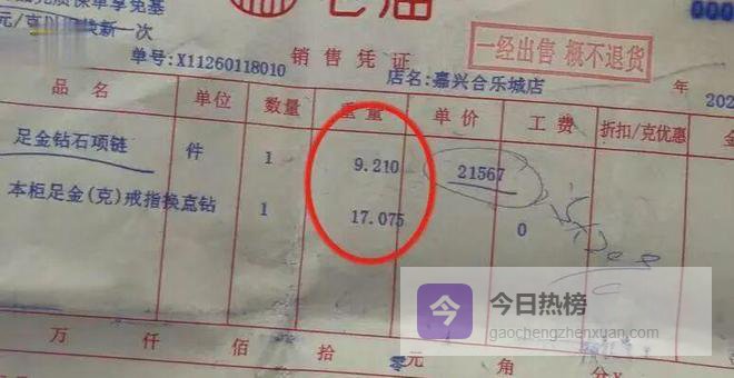 颜阿姨的女儿朱女士说,她当时也在场,瞥见单据上写着“9点几克”,曾提出疑问。销售人员当时回复“就是17克的”。发现克重严重不符后,母女俩返回金店理论。