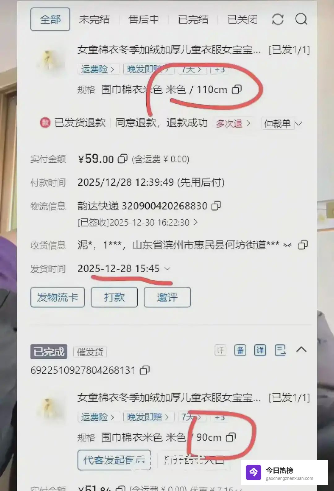 事情是去年深秋翻出来的,山东滨州惠民县的王女士,像所有爱给孩子买买买的母亲一样,在网店里挑了一件90码的童装。孩子穿了一个多月,她似乎觉得版型不错,直到12月底,又拍了一件同款的110码新衣。