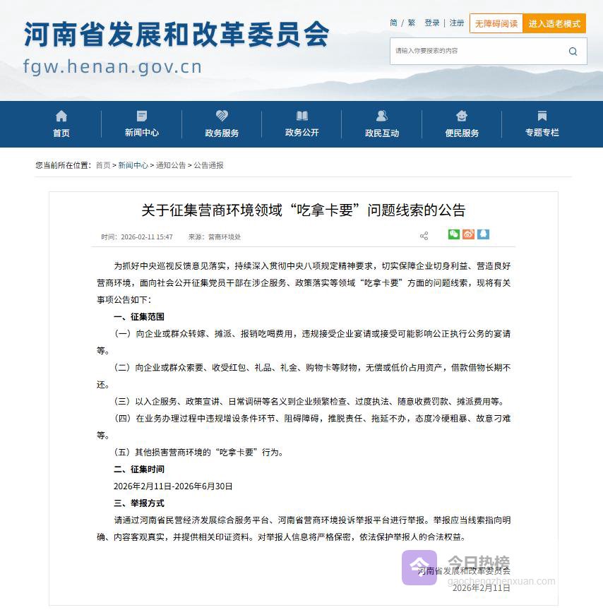 大河网讯 为深入贯彻落实中央巡视反馈意见及中央八项规定精神,切实维护企业合法权益、持续优化营商环境,2月11日,省发展改革委发布公告,即日起,我省面向社会公开征集党员干部在涉企服务、政策落实等过程中存在的“吃拿卡要”问题线索。