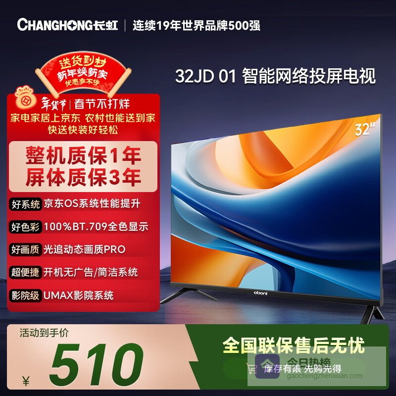 长虹经济款 长虹欧宝丽京东联名款 京东OS 32JD 01 32英寸 无开机广告 智能网络投屏电视 32Z60H ¥