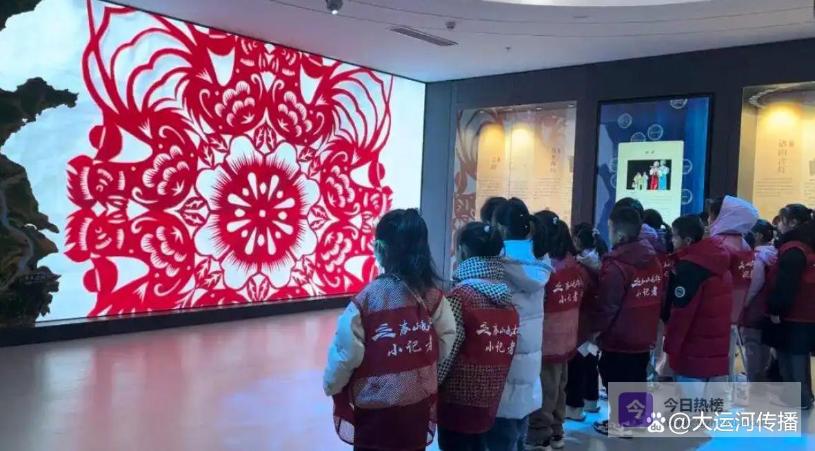一踏入非遗传习中心大厅,以大运河水脉为魂的大型浮雕墙便吸引了小记者们的目光。灰色仿汉画像石上,端鼓腔、腊山道教音乐等非遗元素沿运河脉络铺展,仿佛在诉说着运河滋养下的文化传奇。“这些图案里藏着老辈人过年的习俗吗?”“腊山庙会过年时会有哪些热闹场景?”小记者们围着讲解员频频发问。在270度3D沉浸式体验区,“千帆竞发、舟楫如织”的运河盛景与新春非遗项目元素叠加,让小记者们仿佛穿越时空,亲历了古人沿运河迎新春的热闹场景。